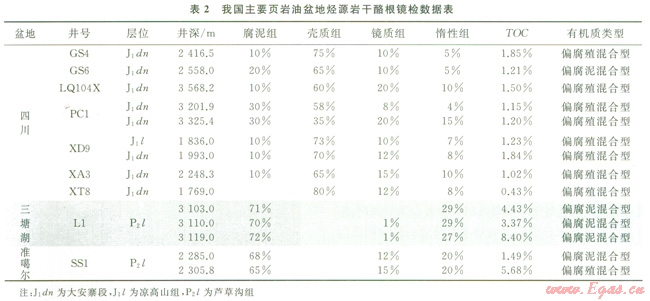 藻類勃發(fā)就是浮游藻類在一定條件和時期形成單屬種的極度生長和富集,具有強烈的排他性。浮游藻類分布極其廣泛,地球表面只要有水的地方,一般都有其蹤跡。藻類勃發(fā)在現(xiàn)代海洋和湖泊往往呈現(xiàn)季節(jié)性,主要類型為硅藻、顆石藻和溝鞭藻等[20]。影響藻類勃發(fā)的因素主要有光照、水溫、營養(yǎng)鹽供給、pH值和溶解氧等,其中前3個因素最為重要[21-23]。藻類勃發(fā)能在短時間內(nèi)產(chǎn)生大量有機質(zhì)聚集,具有極高的生產(chǎn)力,其直接后果是形成藻類沉積紋層。我國主要優(yōu)質(zhì)烴源巖均發(fā)現(xiàn)藻類富集,如渤海灣盆地古近系沙河街組油頁巖中保存有大量層狀藻類體、結(jié)構(gòu)藻類體和藻屑體,且地球化學(xué)分析表明藻類是原油的直接來源[24];鄂爾多斯盆地上三疊統(tǒng)長7段油頁巖的有機質(zhì)來源以藻類為主,陸源高等植物等貢獻十分有限[25];松遼盆地上白堊統(tǒng)青一段湖相富有機質(zhì)泥頁巖以藻類為有機質(zhì)主要來源[26];四川盆地下志留統(tǒng)龍馬溪組產(chǎn)氣頁巖也以藻類為主要生烴來源。筆者等對我國主要致密油產(chǎn)層的烴源巖進行了取樣分析,發(fā)現(xiàn)致密油普遍高產(chǎn)的準噶爾和三塘湖盆地的蘆草溝組烴源巖有機質(zhì)類型以偏腐泥混合型為主,藻類占主導(dǎo)的腐泥組含量較高,一般大于65%;而致密油普遍低產(chǎn)的四川盆地下侏羅統(tǒng)烴源巖有機質(zhì)類型以偏腐殖混合型為主,腐泥組含量偏低,一般小于30%(表2)。