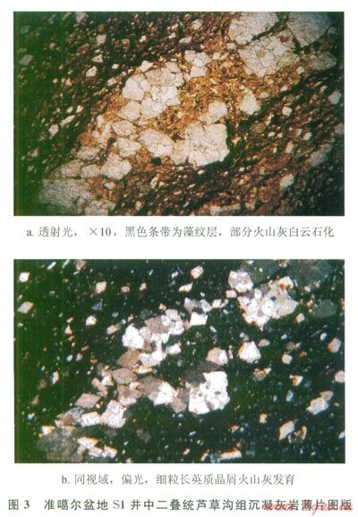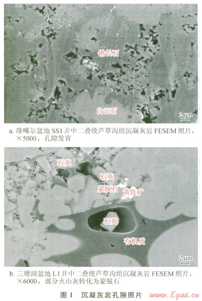 火山灰交代蝕變等成巖作用,不僅能形成大量的次生孔隙(圖1),改善頁巖油氣層的物性,而且火山灰形成的凝灰?guī)r、沉凝灰?guī)r、凝灰質(zhì)泥巖等巖層還能成為頁巖油氣的有效儲層。另外,火山灰含有大量鈾、釷等放射性元素,可加速有機質(zhì)的熱解,對頁巖油氣的生成具有積極意義[15-16]。