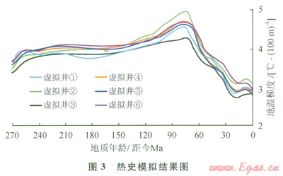 熱史模擬結(jié)果(圖3)表明:南黃海古地溫梯度自二疊系沉積開(kāi)始至上白堊紀(jì)(距今約70Ma)一直呈上升趨勢(shì),最高至5.0℃/l00m,其間有2次快速升高(距今270~260Ma和130~70Ma)和1個(gè)平穩(wěn)期(距今260~130Ma),平穩(wěn)期地溫梯度在4.0℃/l00m左右,70Ma至今地溫梯度總體呈下降趨勢(shì),現(xiàn)今地溫梯度最低,為3.0℃/l00m左右;在最高地溫梯度處(距今約70Ma),各虛擬井的數(shù)值差別最大,最大差別可達(dá)1.0℃/l00m;新近紀(jì)和第四紀(jì)沉積對(duì)古生界烴源巖的深埋增熟作用由于該時(shí)期地溫梯度的降低而減弱。
