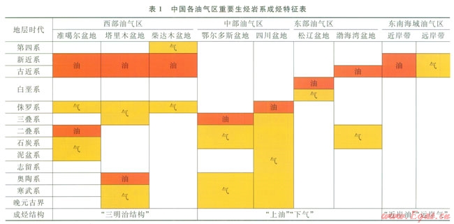 中國(guó)不同盆地群的盆地在縱向上有不同的油氣(包括常規(guī)油氣和非常規(guī)油氣)成烴樣式(表1)。如鄂爾多斯盆地油氣田呈“下氣(古生界)上油(三疊系—侏羅系)”格局、松遼盆地油氣田呈“下氣(下白堊統(tǒng))上油(上白堊統(tǒng))”格局,其他盆地也呈現(xiàn)出油氣田在空間上有序分布的特征(表1)。但以油氣區(qū)(盆地群)為單元,進(jìn)而討論中國(guó)海陸總體油氣田分布規(guī)律的研究并不多見,而進(jìn)一步歸納全國(guó)油氣田空間分布模式、揭示其成因,準(zhǔn)確把握油氣田分布規(guī)律,對(duì)于指導(dǎo)油氣領(lǐng)域勘探有著極其重要的意義。