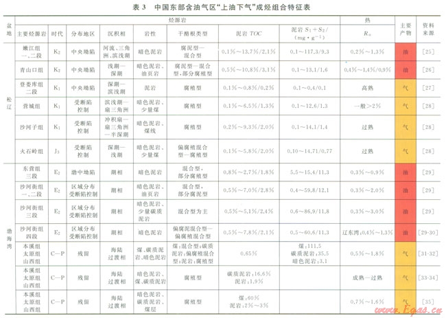 我國(guó)陸地區(qū)東部油氣區(qū)包括東北吉黑中新生代裂谷區(qū)(主要包括松遼盆地、海拉爾盆地、二連盆地、大楊樹盆地、三江盆地等,主要形成于晚侏羅世—白堊紀(jì);僅依蘭—伊通地塹系形成于古近紀(jì))、渤海灣盆地(主要包括下遼河坳陷、遼東灣坳陷、渤中坳陷、濟(jì)陽(yáng)坳陷、黃驊坳陷、冀中坳陷、臨清坳陷、埕寧隆起、滄縣隆起、內(nèi)黃隆起等,主體形成于古近紀(jì))、南華北盆地、南襄盆地、江漢盆地、北黃海盆地和蘇北—南黃海盆地等(圖1)。這些盆地基底為克拉通基底或海西—印支褶皺區(qū)。盆地成盆期及其期次不同、各期盆地原型也不同,經(jīng)歷的改造作用差異巨大,多為殘疊甕地,即多期原型盆地的殘余疊合在一起,烴源巖發(fā)育程度不同(表3)。受區(qū)域熱流場(chǎng)和埋藏作用的綜合控制,烴源巖經(jīng)受不同的熱作用,導(dǎo)致下部層系烴源巖以生氣為主,上部層系烴源巖以生油為主,形成“下氣上油”兩類成烴模式。如松遼盆地白堊系下部生成天然氣、白堊系上部生成巨量石油,呈現(xiàn)出下生氣、上生油的格局;渤海灣盆地前新生代殘余盆地生成天然氣、古近系盆地生成巨量石油,也呈現(xiàn)出“下氣上油”的特點(diǎn)。