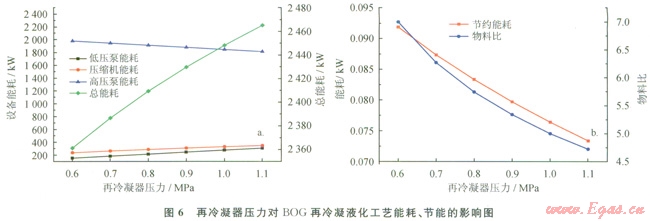 再冷凝器壓力對(duì)BOG再冷凝液化工藝能耗、節(jié)能的影響見圖6。從圖6可以看出,隨著再冷凝器壓力的升高,即低壓泵和壓縮機(jī)壓力的升高,BOG再冷凝液化工藝所消耗的能量相應(yīng)增加,則BOG再冷比增加,當(dāng)LNG接收站處于外輸量最小工況時(shí),操作困難。因此,在實(shí)際生產(chǎn)中,再冷凝器的壓力一般控制在0.7~O.9MPa[8]。
