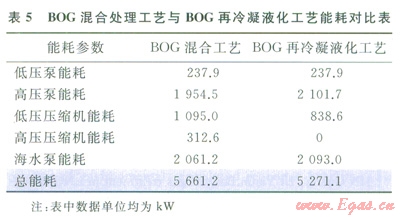 2 不同BOG處理工藝的能耗對(duì)比