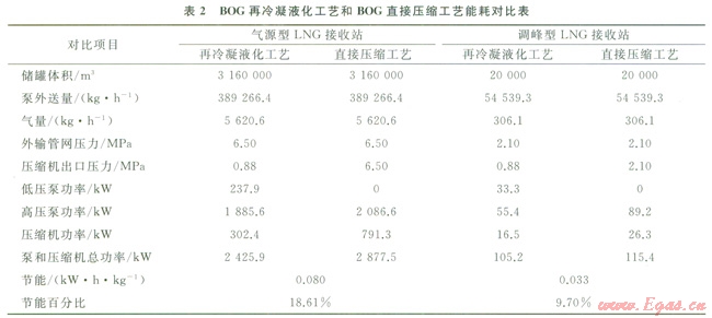 用HYSYS軟件對(duì)氣源型LNG接收站和調(diào)峰型LNG接收站分別采用再冷凝液化和直接壓縮的BOG處理工藝進(jìn)行了模擬計(jì)算(氣源型LNG接收站按青島LNG接收站設(shè)計(jì)參數(shù)進(jìn)行模擬),模擬圖分別見圖1、2,能耗對(duì)比結(jié)果見表2??梢钥闯觯瑹o論是對(duì)調(diào)峰型LNG接收站還是氣源型LNG接收站,BOG再冷凝液化工藝都比BOG直接壓縮工藝更為節(jié)能。