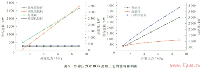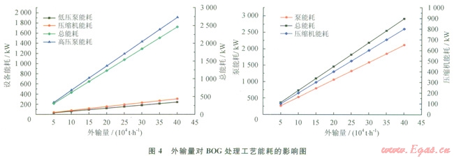 1)BOG再冷凝液化工藝的能耗均小于BOG直接壓縮工藝的能耗。針對(duì)2種BOG處理工藝,外輸量的改變幾乎不影響再冷凝器的節(jié)能效果,但當(dāng)BOG量較大時(shí),BOG再冷凝液化工藝的節(jié)能效果更顯著。