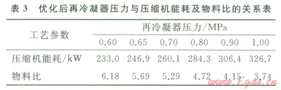 從圖6-b及表3可以看出,工藝優(yōu)化前再冷凝器壓力為0.88MPa時(shí)的物料比與工藝優(yōu)化后再冷凝器壓力為0.65MPa時(shí)的物料比接近,而壓縮機(jī)能耗則由302.4kW降為246.9kW,降低l8.2%,節(jié)能效果明顯。