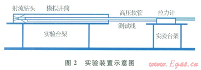 實(shí)驗(yàn)裝置示意圖如圖3所示。模擬井筒水平放置,固定于實(shí)驗(yàn)臺(tái)架上。實(shí)驗(yàn)臺(tái)架固定于地面上,保證實(shí)驗(yàn)時(shí)模擬井筒不發(fā)生移動(dòng)或轉(zhuǎn)動(dòng)。連接高壓軟管的多孔射流鉆頭放置于模擬井簡內(nèi),將拉力測試線一端連接于多孔射流鉆頭后端接頭,另一端連接于拉力計(jì)上。拉力計(jì)固定于另一實(shí)驗(yàn)臺(tái)架上,2個(gè)實(shí)驗(yàn)臺(tái)架高度相同,以確保拉力測試線水平。實(shí)驗(yàn)時(shí),2個(gè)實(shí)驗(yàn)臺(tái)架均固定在地面上,通過拉力測試線長度來確定射流鉆頭的正向噴距。經(jīng)實(shí)驗(yàn)測量,當(dāng)柴油機(jī)的轉(zhuǎn)數(shù)相同時(shí),無論連接哪種射流鉆頭,高壓泵的排量大小都相差不大。因此在實(shí)驗(yàn)中,通過固定柴油機(jī)轉(zhuǎn)數(shù)的方法來保證應(yīng)用不同射流鉆頭時(shí)流量相同。