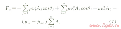 由于所選控制體關(guān)于x軸的對稱,其在y軸方向的動(dòng)量變化可以相互抵消,故只需分析控制體內(nèi)z軸方向的動(dòng)量變化和受力情況,故將式(1)投影于x軸可得: