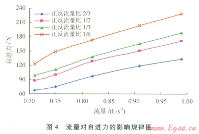因?yàn)閷?shí)驗(yàn)用多孔射流鉆頭的反向射流流量均大于正向射流流量,由理論分析可知,射流鉆頭會(huì)產(chǎn)生向前的自進(jìn)力,并且隨著流量的增大自進(jìn)力也隨之增大。自進(jìn)力測試實(shí)驗(yàn)也驗(yàn)證了這一點(diǎn),如圖4所示。選取正反流量比為2/3、1/2、1/3和1/6的射流鉆頭進(jìn)行實(shí)驗(yàn),當(dāng)正向噴距為10mm,井簡直徑為49mm時(shí),自進(jìn)力隨著流量的增大也隨之增大,近似呈線性關(guān)系變化。以正反流量比為2/3的射流鉆頭為例,流量為0.71L/s時(shí),產(chǎn)生的自進(jìn)力為67.8N;流量為0.75L/s時(shí),產(chǎn)生的自進(jìn)力為74.8N;流量為0.82L/s時(shí),產(chǎn)生的自進(jìn)力為96.9N;流量為0.9lL/s時(shí),產(chǎn)生的自進(jìn)力為118.7N;流量為0.99L/s時(shí),產(chǎn)生的自進(jìn)力為133.2N。這是因?yàn)殡S著流量的增大,射流的總動(dòng)量也隨之增大,反向射流產(chǎn)生的反推力更大,反向射流產(chǎn)生的降壓效果也更加明顯。故可以產(chǎn)生更大的自進(jìn)力。在實(shí)驗(yàn)條件下,流量從0.71L/s增加到0.99L/s,4種不同正反流量比的射流鉆頭所產(chǎn)生的自進(jìn)力范圍為67.8~228.1N。