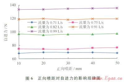 噴距是高壓水射流技術(shù)中的一個(gè)重要參數(shù),正向噴距是指射流鉆頭前端面與井底之間的距離。如圖6所示,在實(shí)驗(yàn)條件下,選取正反流量比為2/3的射流鉆頭作為研究對象,井筒直徑選取49mm,隨著正向噴距的增大,在同一流量下射流鉆頭產(chǎn)生的自進(jìn)力變化不大,基本持平。以流量為0.91L/s時(shí)為例,噴距為10mm時(shí),自進(jìn)力為ll8.7N;噴距為20mm時(shí),自進(jìn)力為ll9.6N;噴距為30mm時(shí),自進(jìn)力為ll7.8N;噴距為40mm時(shí),白進(jìn)力為ll8.9N;噴距為50mm時(shí),自進(jìn)力為ll9.1N。這主要是因?yàn)樯淞魉a(chǎn)生的反沖力大小僅與噴嘴出口處流速有關(guān),與接觸靶物時(shí)的速度無關(guān),故反沖力大小與正向噴距無關(guān),同時(shí)井筒直徑大小不變,改變正向噴距并不影響反向射流的降壓效應(yīng),所以正向噴距對自進(jìn)力的影響不大。在實(shí)驗(yàn)條件下,井筒直徑為49mm,排量范圍為0.71~0.99L/s,噴距從10mm增加到50mm時(shí),正反流量比為2/3的射流鉆頭所產(chǎn)生的白進(jìn)力范圍為67.8~135.2N。