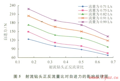 當(dāng)流量不變時(shí),射流鉆頭的正反流量比對自進(jìn)力的影響就顯得比較重要。通過實(shí)驗(yàn)測量發(fā)現(xiàn),射流鉆頭所產(chǎn)生的自進(jìn)力隨著正反流量比的增大而減小,近似呈線性關(guān)系變化(圖5)。以噴距為10mm,井筒直徑為49mm,流量為0.99L/s時(shí)為例,正反流量比為2/3的射流鉆頭所產(chǎn)生的自進(jìn)力為133.2N;正反流量比為l/2的射流鉆頭所產(chǎn)生的自進(jìn)力為171.9N;正反流量比為l/3的射流鉆頭所產(chǎn)生的牽引力為188.5N;正反流量比為l/6的射流鉆頭產(chǎn)生所產(chǎn)生的牽引力為228.1N。這是因?yàn)殡S著正反流量比的減小,反向射流的流量分配比例增大,反向射流所產(chǎn)生的反推力也增大,同時(shí)反向射流的降壓效應(yīng)也越明顯,故可以產(chǎn)生更大的自進(jìn)力。在實(shí)驗(yàn)條件下,射流鉆頭流量比從1/6增大到1/3,排量在0.71~0.99L/s時(shí)范圍,所產(chǎn)生的自進(jìn)力范圍為67.8~228.1N。
