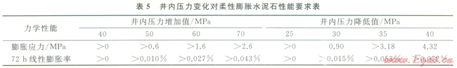 井下作業(yè)公司柔性自應(yīng)力水泥石能在高圍壓條件下膨脹,產(chǎn)生0.5~3.0MPa膨脹壓應(yīng)力,楊氏模量在5~7GPa,泊松比約為0.19,抗拉強(qiáng)度在2.5~3.5MPa。當(dāng)固井后井內(nèi)壓力增加時(shí),通過釋放壓縮應(yīng)力,減小水泥環(huán)周向拉應(yīng)力,避免拉伸破壞,同時(shí)外觀體積微膨脹,可阻止微環(huán)隙形成。由公式(1)、(2)計(jì)算出表5所示不同井內(nèi)壓力變化情況下柔性膨脹水泥石體積膨脹要求。該水泥漿體系在相國寺儲(chǔ)氣庫井技術(shù)套管、頁巖氣井的油層套管固井中得到了成功應(yīng)用,固井質(zhì)量?jī)?yōu)質(zhì),在經(jīng)過試壓、大型體積壓裂作業(yè)后,環(huán)空封固質(zhì)量好,未發(fā)生氣竄。