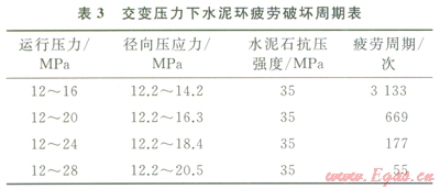 地下儲(chǔ)氣庫井天然氣注入和采出的作業(yè)使作用在井內(nèi)套管的內(nèi)壓力交替變化。這種交變壓力可能引起水泥石內(nèi)部固有的微裂紋緩慢擴(kuò)展、連通,導(dǎo)致水泥石疲勞破壞[9-11]。以井深2107m的儲(chǔ)氣庫井為例,水平地應(yīng)力30MPa,井徑215.9mm,套管直徑l77.8mm,壁厚11.51mm,運(yùn)行壓力12~28MPa,水泥石楊氏模量l0GPa,泊松比0.19,根據(jù)水泥石疲勞破壞方程[12]計(jì)算出交變壓力作用下普通水泥石疲勞破壞周期如表3所示。儲(chǔ)氣庫井注采氣過程中運(yùn)行壓力越高,普通水泥環(huán)越易疲勞破壞。當(dāng)達(dá)到最大運(yùn)行壓力時(shí),只需數(shù)十次注采周期,水泥環(huán)即發(fā)生疲勞破壞。