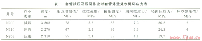 該作業(yè)使作用在井內(nèi)套管的內(nèi)壓力大幅度升高。四川盆地頁巖氣井Æl39.7mm油層套管固井后(套管壁厚9.17mm,井眼尺寸215.9mm)對(duì)套管柱試壓及壓裂作業(yè),井口壓力高達(dá)60MPa。N203井等井固井質(zhì)量?jī)?yōu)質(zhì)率100%,但試壓或光套管壓裂作業(yè)后均出現(xiàn)環(huán)空帶壓。該區(qū)塊水泥石楊氏模量l0GPa,泊松比0.19,其余計(jì)算條件及結(jié)果如表l所示,由公式(1)和(2),試壓或壓裂作業(yè)后,套管壁處水泥環(huán)周向應(yīng)力均超過抗拉強(qiáng)度,發(fā)生拉伸破壞,導(dǎo)致水泥環(huán)密封失效。