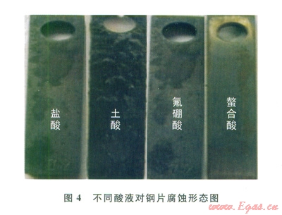 從圖4中可以看出,螯合酸腐蝕不是很明顯,表面附著少許薄膜,且表面光鮮明亮,而其他3種無機酸液對鋼片腐蝕嚴重,表面有黑色的物質,同時具有明顯的腐蝕溝槽。