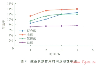 實驗設計了4種酸液與某油氣田沙河街組儲層的巖粉反應,對比在1h、2h、3h、4h酸液對巖粉的溶蝕率,以及最終的溶蝕率,研究螯合酸液體系的緩速性能。實驗溫度l30℃,實驗4種酸液分別為:10%HCl、10Y00 HCl+2%HF、10%HCl+8%HBF4、l0%螯合酸。實驗結果表明(圖2):鹽酸與巖粉反應速率最快,溶蝕率最低,土酸與巖粉反應溶蝕率最高,在2h反應基本完成,氟硼酸溶蝕率比螯合酸略低;鹽酸溶蝕率基本保持在7.5%,土酸溶蝕率在2h變化較大,之后基本無很大變化,溶蝕率最高達l3.9%,螯合酸表現(xiàn)出明顯的緩速性能,隨著反應時間延長,螯合酸溶蝕率逐漸升高,最高達l2.6%。