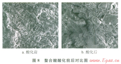 實驗結果表明:經過螯合酸酸化后巖心滲透率顯著提高,滲透率提高將近3倍,而經過土酸酸化后巖心滲透率降低,降低幅度達50%,且使用土酸進行酸化流動過程中出現(xiàn)巖心脫砂現(xiàn)象,而螯合酸沒有出現(xiàn)脫砂問題,電鏡掃描結果也顯示土酸酸化后巖心的骨架結構破壞,表面膠結強度降低,黏土礦物結構遭到破壞,所以出現(xiàn)砂現(xiàn)象。通過掃描螯合酸酸化流動前后巖心端面發(fā)現(xiàn),巖石骨架結構未被破壞,且出現(xiàn)明顯的溶蝕孔道,從掃描電鏡看出酸化流動后巖石的膠結情況完好,未出現(xiàn)結構破壞現(xiàn)象。