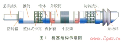速鉆橋塞包括丟手機構、錨定機構和密封機構,主要由丟手接頭、防轉帽、推筒、整體式卡瓦、錐體、保護套、外膠筒、中膠筒、防轉接頭、泵送環(huán)等零件組成,結構如圖1所示。