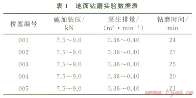 將坐封有新型速鉆復合橋塞的試驗套管固定于專用鉆磨試驗架上,如圖5所示,用Æ73mm螺桿馬達帶專用磨鞋,水泥車泵注清水驅動螺桿馬達,進行了5套橋塞鉆磨實驗,其實驗數(shù)據(jù)如表1所示。