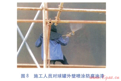 為保證球罐外壁的防腐質(zhì)量,要求對球罐外壁進(jìn)行噴砂除銹處理,除銹等級達(dá)到Sa2.5級(非常徹底的噴射或拋射除銹)。施工人員對球罐外壁進(jìn)行噴砂除銹、噴涂防腐油漆分別見圖7、8。