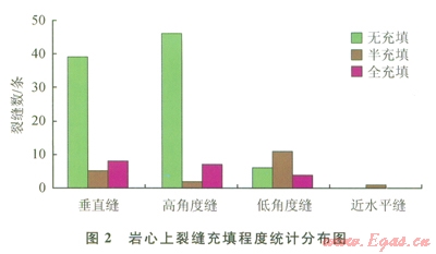 裂縫的充填特征決定了后期裂縫的有效性,對(duì)須二段裂縫充填性的統(tǒng)計(jì)結(jié)果表明:垂直和高角度裂縫主要為未充填縫,該類裂縫達(dá)到70.54%;半充填縫和全充填縫均占l4.73%,全充填裂縫主要為低角度縫。因此從裂縫有效性來(lái)看,該區(qū)須二段裂縫有效性高,且有效裂縫主要以垂直縫和高角度縫為主(圖2) [9]。