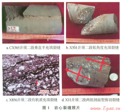 通過(guò)對(duì)巖心縫面觀察、薄片微觀裂縫的鑒定,該區(qū)超過(guò)80%的天然裂縫縫面平滑干凈,無(wú)明顯充填特征,少數(shù)天然裂縫縫面見(jiàn)不同程度方解石充填(圖1-b)、石英充填和有機(jī)質(zhì)充填(圖1-c);另外泥質(zhì)巖類縫面也見(jiàn)剖面型擦痕(圖l-d),表明存在剪性裂縫。
