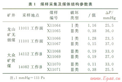 龍山礦和大眾礦均為突出礦井,在龍山礦同時(shí)具有軟硬煤的地點(diǎn)采集了4組煤樣;大眾礦煤質(zhì)較軟,采集了4組軟煤煤樣,測試煤的堅(jiān)固性系數(shù)f值和瓦斯放散初速度DP。煤樣采集信息及煤體結(jié)構(gòu)參數(shù)見表1。