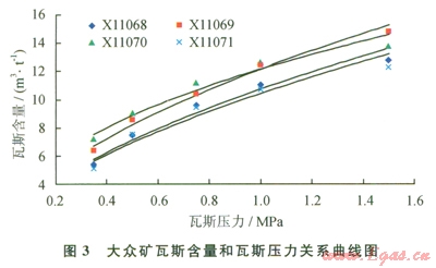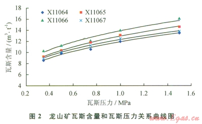 3)實(shí)驗(yàn)室研究了瓦斯含量和瓦斯壓力的相互關(guān)系,龍山礦無煙煤瓦斯壓力0.74MPa對應(yīng)的瓦斯含量為l0.9~12.6m3/t,最低為l0.9m3/t;大眾礦貧煤對應(yīng)的瓦斯含量為9.04~10.7m3/t,最低為9.04m3/t。