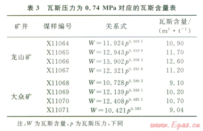 從實(shí)驗(yàn)結(jié)果可以看出,瓦斯壓力和瓦斯含量具有指數(shù)關(guān)系,對圖2、3的瓦斯含量和瓦斯壓力數(shù)據(jù)擬合分析,可得出瓦斯壓力0.74MPa對應(yīng)的瓦斯含量(表3)。從該表可以看出,龍山礦無煙煤瓦斯壓力0.74MPa對應(yīng)的瓦斯含量為l0.9~12.6m3/t,平均為11.58m3/t;大眾礦貧煤對應(yīng)的瓦斯含量為9.04~10.7m3/t,平均為9.76m3/t。從實(shí)驗(yàn)結(jié)果可以認(rèn)為,龍山礦瓦斯含量在10.9m3/t就有可能具有突出危險(xiǎn)性;而大眾礦瓦斯含量在9.04m3/t就可能發(fā)生突出。