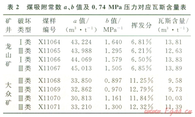 采用WY-98B型全自動(dòng)瓦斯吸附常數(shù)測定儀,測定了龍山礦和大眾礦的吸附常數(shù)a、b值和揮發(fā)分等參數(shù),測試結(jié)果見表2。