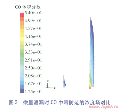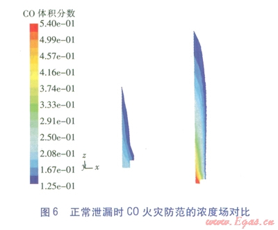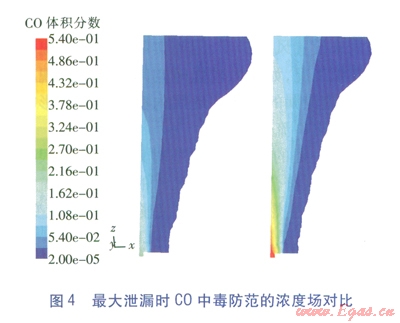 值得一提的是,火災(zāi)防范時(shí)只將爆炸極限列為危害區(qū)間,這符合不發(fā)生明火時(shí)的氣體冷態(tài)擴(kuò)散情況,但一旦發(fā)生燃燒,C0的濃度場(chǎng)將發(fā)生極大變化,還將產(chǎn)生對(duì)人員窒息的煙氣。FLUENT作為一款功能強(qiáng)大的軟件,也能模擬燃燒情況(俗稱熱態(tài)研究),但這將大大增加參數(shù)設(shè)定的復(fù)雜性和計(jì)算過(guò)程冗時(shí)性,這是工程計(jì)算力求避免的,但應(yīng)是理論研究的改進(jìn)方向。