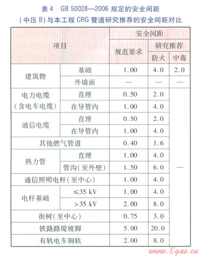 GB 50028--2006規(guī)定的安全間距(中壓B)與本工程CRG管道研究推薦的安全間距對(duì)比見(jiàn)表4。