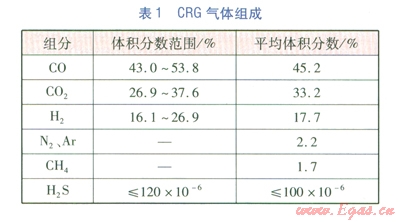 CRG是在COREX非高爐煉鐵反應(yīng)時(shí)產(chǎn)生的氣體,屬于人工煤氣,沒(méi)計(jì)輸送壓力為0.2 MPa,標(biāo)準(zhǔn)狀態(tài)下的低熱值為8.231MJ/m3,其一氧化碳含量較高,氣體組成見(jiàn)表1。