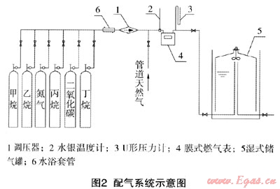 圖2為采用上述配氣方案時(shí)的流程示意圖。純組分氣體由鋼瓶減壓后,首先經(jīng)過水浴套管和減壓器,再經(jīng)膜式燃?xì)獗碛?jì)量,進(jìn)入內(nèi)置攪拌器的5m,濕式儲(chǔ)氣罐。