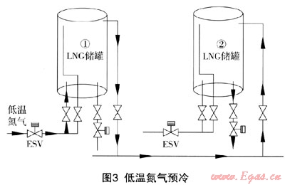 ② 低溫氮?dú)忸A(yù)冷時(shí)建議根據(jù)能量級(jí)梯使用原則,充分利用氮?dú)?,從而?jié)約液氮成本,參考工序如圖3:低溫氮?dú)鈴?號(hào)儲(chǔ)罐下進(jìn)液管進(jìn)、BOG氣相管出,從BOG氣相管進(jìn)2號(hào)儲(chǔ)罐,從2號(hào)儲(chǔ)罐出液閥出,最后在空溫氣化器后管道進(jìn)行放散。