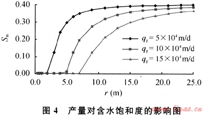 圖4為不同產(chǎn)量下含水飽和度隨徑向距離變化(生產(chǎn)時間為75d)的曲線。顯示距井筒越近水相蒸發(fā)越明顯,隨著產(chǎn)量的增加水相蒸發(fā)的影響半徑逐漸從井筒向地層延伸,產(chǎn)量越高影響半徑越大。