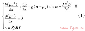 相對于其他項數(shù)值較小,可以忽略[11]。b.在城市燃氣管網(wǎng)中,管道的標高差值不太大,因此,動量方程中的重力項g(ρ-ρa)sinα一般忽略不計。