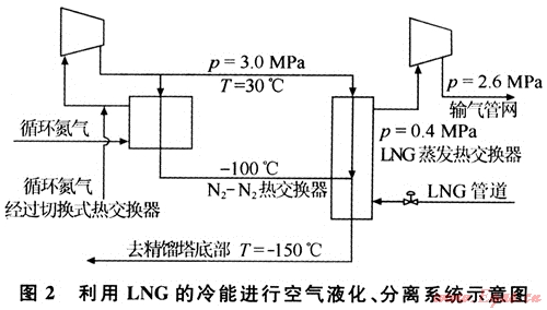 常用的空氣分離法是將空氣液化,通過(guò)氟利昂冷凍機(jī)、透平膨脹機(jī)進(jìn)行空氣的液化和分離,制成液態(tài)的氮?dú)狻⒀鯕?、氬氣等。而LNG冷熱能用于空氣分離則是通過(guò)循環(huán)氮?dú)獾睦鋮s來(lái)實(shí)現(xiàn)(見(jiàn)圖2)。一般來(lái)說(shuō),生產(chǎn)10×104m3的液態(tài)氣體大約需要650×104kJ的冷卻能。利用LNG的冷熱能,循環(huán)氮?dú)鈮嚎s機(jī)可小型化;因不需要冷凍機(jī),建設(shè)費(fèi)用也可相應(yīng)減少;此外,LNG作為空氣分離裝置的預(yù)冷劑,生產(chǎn)液氬的空分裝置中,利用其冷能冷卻和液化由下塔抽出經(jīng)過(guò)復(fù)熱的循環(huán)氮,可以省去氟利昂制冷機(jī)以及氮透平膨脹機(jī)組,使產(chǎn)品能耗平均降低0.5kwh/m3,裝置的投資費(fèi)用可減少10%左右,生產(chǎn)成本降低20%~30%。