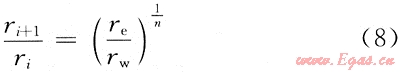 對于穩(wěn)態(tài)滲流的氣井,在離井較遠的地方,壓力變化比較緩慢;而在井的附近,壓力下降卻非??臁T谟脭?shù)值方法求解氣井產(chǎn)量時,采用非均勻網(wǎng)格,即數(shù)值模擬柱坐標(biāo)系統(tǒng)中常用的沿徑向節(jié)點坐標(biāo)分布公式: