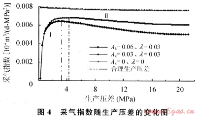 與低滲透變形介質(zhì)油藏合理生產(chǎn)壓差的定義相同,Qsc/(pe2-p22)(氣井采氣指數(shù))最大值對應(yīng)的壓差即為合理生產(chǎn)壓差(圖4),當(dāng)Ak=0.06、λ=0.03時,合理生產(chǎn)壓差為3.21MPa;當(dāng)Ak=0.03、λ=0.03時,合理生產(chǎn)壓差為4.28MPa,應(yīng)力敏感常數(shù)越大,氣井的合理生產(chǎn)壓差越小。