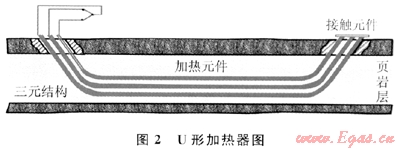 引入導(dǎo)線將加熱元件耦聯(lián)到地層表面上。加熱元件耦聯(lián)到位于地層的底層上或附近的接觸元件。接觸元件耦聯(lián)到接觸部分中的接觸器上,以使支腿間彼此電氣耦聯(lián)以形成三元結(jié)構(gòu)。三元結(jié)構(gòu)耦聯(lián)到水平連接井。該加熱器的優(yōu)點(diǎn)是電氣耦聯(lián)多樣化,較易實(shí)施,缺點(diǎn)是直線排布三元結(jié)構(gòu)不利于加熱頁(yè)巖層。 2.2 電加熱井的設(shè)計(jì)