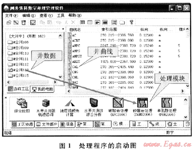 處理程序在設(shè)計時,應(yīng)用了Windows系統(tǒng)的拖放功能實現(xiàn)對數(shù)據(jù)的調(diào)度,只要將井?dāng)?shù)據(jù)拖到相應(yīng)處理模塊圖標(biāo)上,則可應(yīng)用該模塊進(jìn)行處理(圖1)。