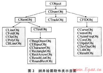 要解決這些問題,采用面向?qū)ο蟪绦蛟O(shè)計(jì)理念是最佳的選擇[3]。在圖2軟件主要類的劃分及繼承關(guān)系圖中,CDrawObj類是直接從CObject繼承而來的所有測井圖形類的基類,主要保存著圖形對(duì)象的繪圖區(qū)域(m_Rect)和當(dāng)前繪圖文檔的指針(*pDoc),完成光標(biāo)在屏幕上的滾動(dòng)DoScroll(CScrollView*pView),保存、顯示當(dāng)前光標(biāo)所在位置等功能,它是測井繪圖軟件所有對(duì)象動(dòng)態(tài)識(shí)別的入口。
