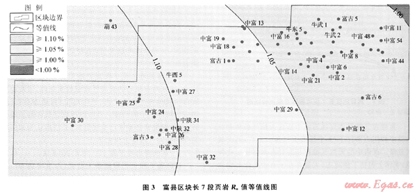 根據(jù)美國和加拿大的勘探開發(fā)結(jié)果,形成頁巖氣的頁巖有機質(zhì)成熟度(Ro)值為0.4%~3.0%。如Barnett頁巖的成熟度就屬于中等-較高范圍,Ro為1.0%~2.1%[9]。區(qū)域上對延長組有機質(zhì)熱演化的研究表明,早白堊世中期進入成熟門限,早白堊世末期進入大量生烴門限,古近紀進入高成熟期。富縣地區(qū)曾經(jīng)是埋深最大的生油中心,Ro值大于1%,有機質(zhì)成熟度較高。該區(qū)中富2、中富30、葫43井主要生油巖長7段鏡質(zhì)體反射率分別為1.13%、1.06%、1.10%;總體上西部頁巖有機質(zhì)演化程度高于東部(圖3)。