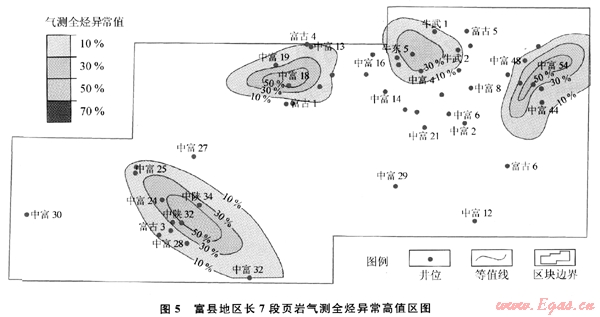 綜合考慮上述影響因素,繪制的長7段頁巖氣測全烴異常高值區(qū)圖顯示(圖5)