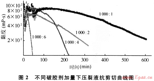 為了在流變儀器上盡量模擬高剪切,做剪切實(shí)驗(yàn)時(shí)首先在900s-1下剪切1min,然后再做170s-1下的剪切。圖2是廣安002-X36井不同破膠劑加量下壓裂液抗剪切的實(shí)驗(yàn)結(jié)果,結(jié)果表明壓裂液能滿足超大規(guī)模加砂壓裂的耐剪切的要求。