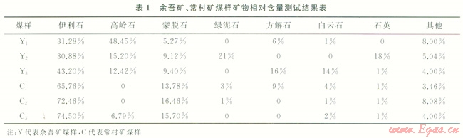 目前,沁水盆地東南部的潞安礦區(qū)是傘國煤層氣開發(fā)的熱點(diǎn)區(qū)域之一。部分井正在進(jìn)行注CO2現(xiàn)場試驗,為了解煤中主要黏土礦物含量,通過采集潞安礦區(qū)余吾礦和常村礦煤樣,應(yīng)用x射線衍射進(jìn)行了黏土礦物相對含量測試,結(jié)果見表1。