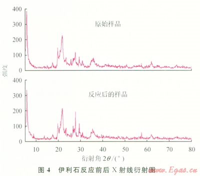 用X射線衍射儀對與pH值為4.3碳酸溶液反應(yīng)前后的伊利石礦物進(jìn)行測試,測試結(jié)果見圖4。