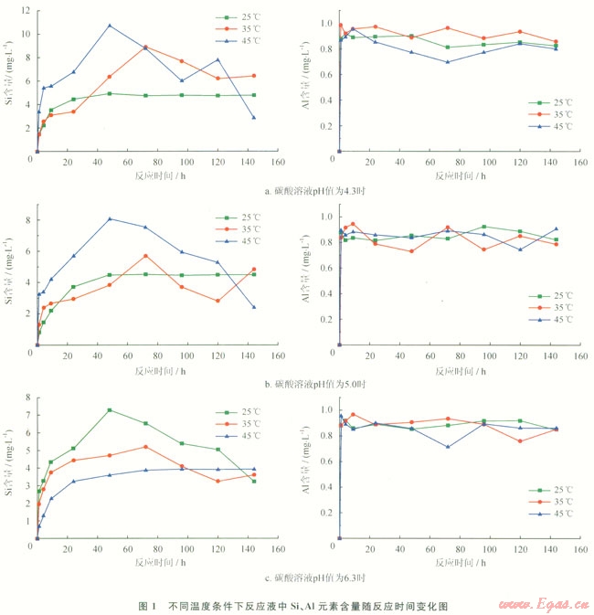 配制pH值分別為4.3、5.0、6.3的碳酸溶液,使用精密天平稱取質(zhì)量為2.0000g的伊利石礦物,將礦物放入惰性的塑料反應(yīng)瓶中,按照1:15固/液比(g/mL)加入不同pH值的碳酸溶液,輕微搖晃后密封,放入恒溫箱中,模擬現(xiàn)場儲層溫度,把反應(yīng)溫度分別設(shè)置為25℃、35℃和45℃,反應(yīng)不同的時間后(1h、4h、9h、24h、48h、72h、96h、120h、144h),將E清液過濾,對濾液中的Si、Al元素含量進(jìn)行測試。測試方法分別為鉬酸比色法和鉻天青比色法[17],測試儀器為上海佑科721型分光光度計,使用D8ADVANCE型X射線衍射儀測試分析與碳酸反應(yīng)前后伊利石礦物晶體結(jié)構(gòu)的變化。