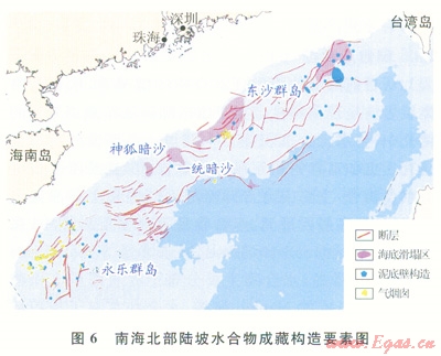 2)南海北部陸坡從西部 中部一東部體現(xiàn)出不同的地質(zhì)構(gòu)造特點(diǎn),其強(qiáng)烈差異性對(duì)水合物的富集成藏產(chǎn)生深刻的影響。東部以臺(tái)西南盆地北緣成藏條件最為優(yōu)越,水合物主要通過氣體的垂向與側(cè)向結(jié)合運(yùn)聚方式成藏,為復(fù)合型水合物發(fā)育的有利區(qū);中部以珠江口盆地白云凹陷南坡為代表,水合物主要通過氣體的側(cè)向運(yùn)聚模式成藏,驅(qū)動(dòng)力受淺層流體勢(shì)控制明顯,為分散型水合物發(fā)育區(qū);西南部以瓊東南盆地的深水帶成藏條件優(yōu)越,新近紀(jì)來構(gòu)造沉降速率較大,沉積厚度大,泥底辟和氣煙囪體發(fā)育,對(duì)水合物成藏控制明顯,水合物主要通過氣體的垂向運(yùn)聚模式成藏,有利于發(fā)育滲漏型水合物藏。